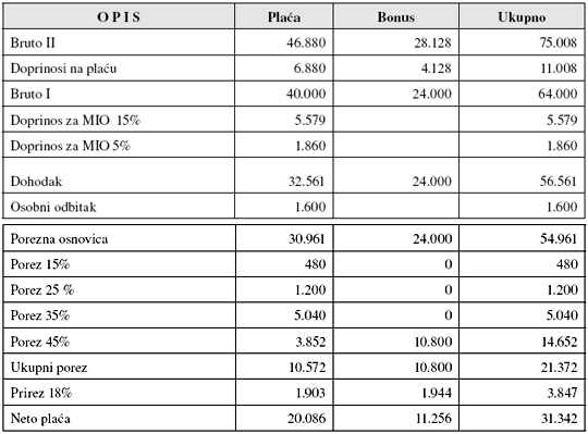 U idućem primjeru prikazuje se obračun plaće za jedan mjesec i kumulativni obračun bonusa za tri mjeseca, koji čini dio plaće. U ovom slučaju na iznos bonusa koji čini sastavni dio plaće ne plaća se doprinos za MIO jer je doprinos već obračunan na najvišu mjesečnu osnovicu za obračun obveznih doprinosa, koja iznosi od 37.194 kune.